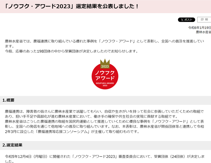 本日1月19日(金)午後、農林水産省のHPに、ノウフクアワード2023受賞24団体が発表され、夢育て農園がチャレンジ賞に選ばれましたhttps://www.maff.go.jp/j/press/nousin/kouryu/240119.html 。今年首都圏で受賞したのは夢育て農園のみです。