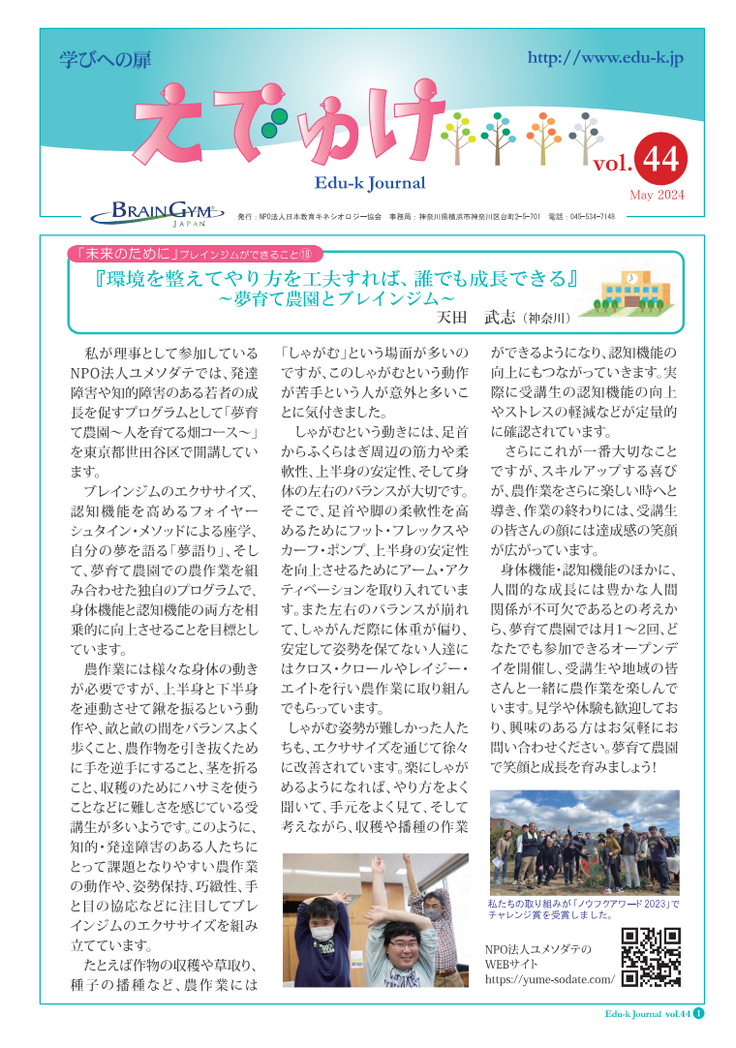 NPO法人ユメソダテの天田武志理事が、BrainGymの日本教育キネシオロジー協会の機関誌”えでゅけ”に夢育て農園の"人を育てる畑"について、主に身体発達の観点から記事を書いて下さいました。