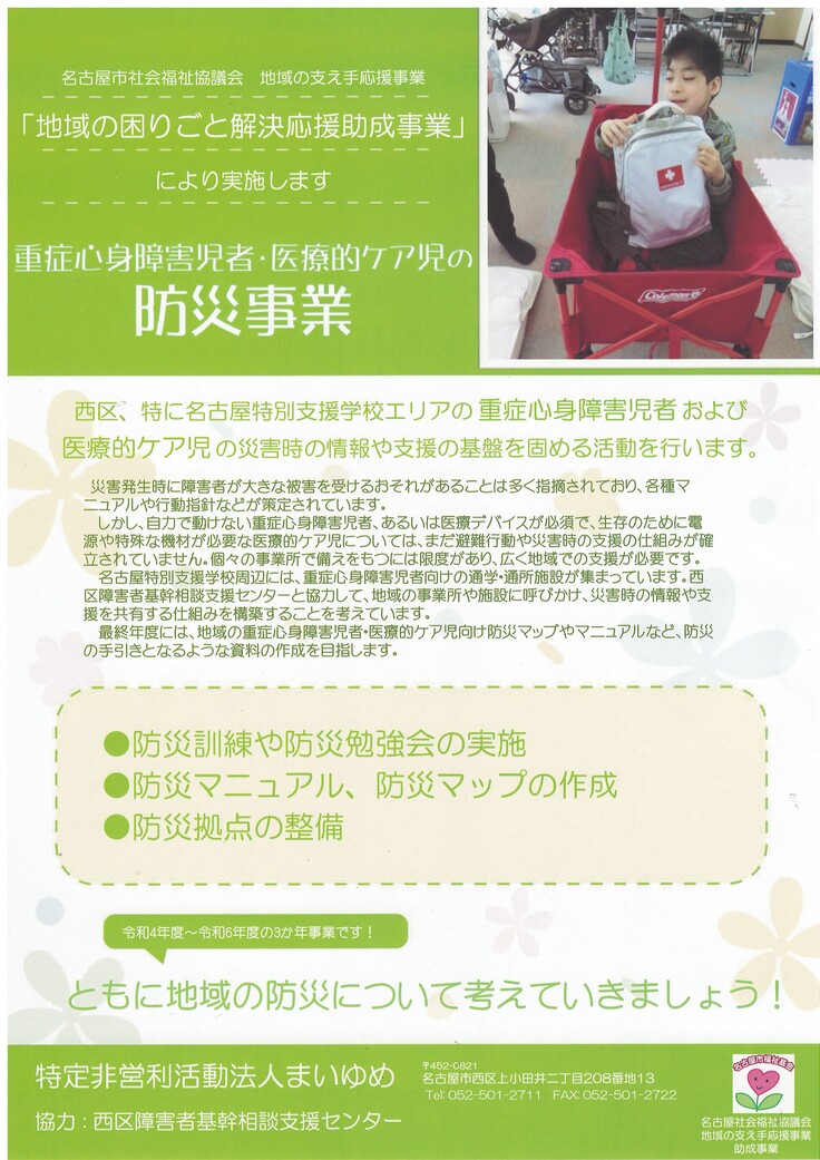 まいゆめの防災対策へのご意見や、BCPの作成でのアドバイス、スタッフ・ご家族勉強会の開催に防災イベントへの助言や参加など、