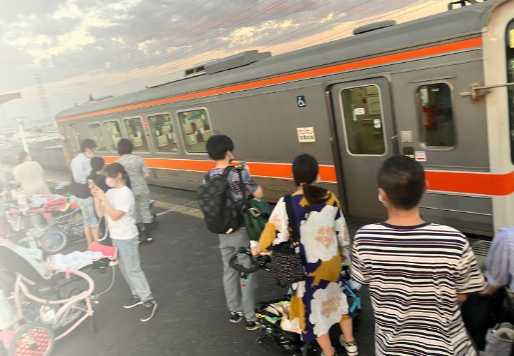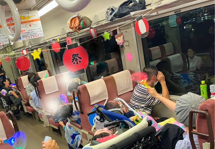 電車の中でも花火が始まるタイミングに向けて気分を盛り上げて