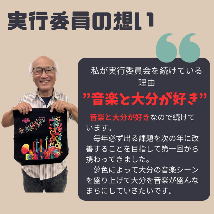 そして、音楽祭に関わる人にとって音楽祭が誇りとなり、大分の音楽シーンを盛り上げ、地元愛をはぐくむことで大分の活性化に貢献することを目指しています。