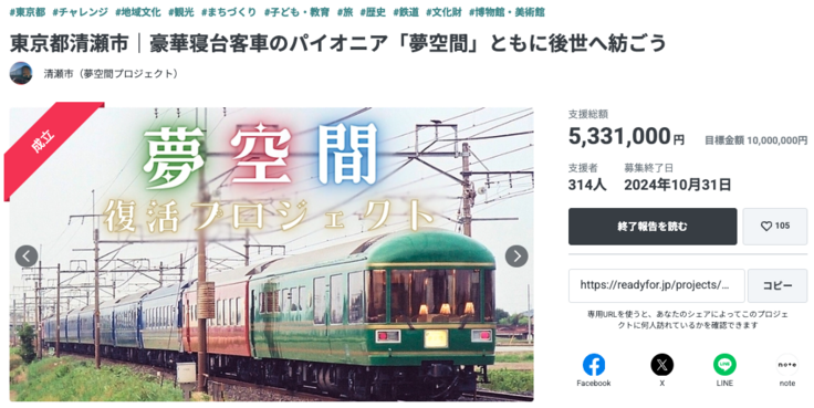 夢空間を本市の新たなランドマークとして、清瀬の地で復活させるため、昨年夏に実施したクラウドファンディングにおきましては、全国より多くのみなさまから多大なるご支援と応援コメントを頂戴し、誠にありがとうございました。この場を借りて、あらためて御礼申し上げます。