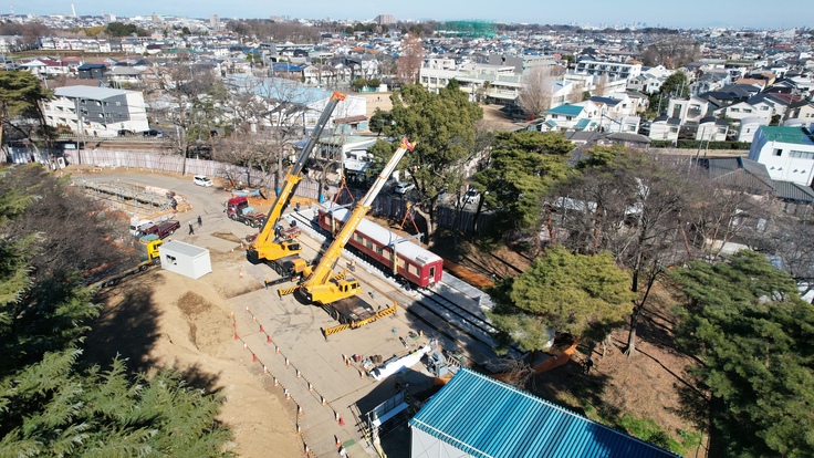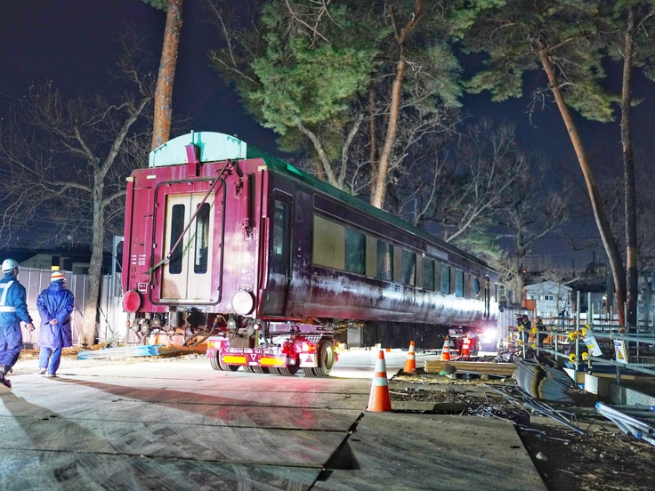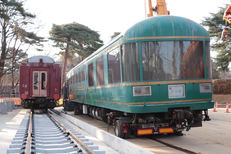 昨年夏には、車両搬出入費用の一部に充当することを目的としたクラウドファンディングを実施し、全国の多くの皆さまから温かいご支援と励ましの言葉をいただきました。誠にありがとうございました。2025年1月には、夜間から早朝にかけて二日間にわたり、車両の搬出入を実施し、無事に中央公園に2両を設置し、現在は外装等の修復工事を行っております。