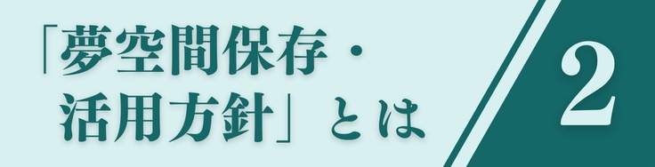 方針には「夢空間」を文化財として適切に保存し、後世に引き継ぐとともに、「新たなにぎわい」の創出はもとよりシティプロモーションの促進やシビックプライドの醸成を実現するために活用することを謳っています。今後はこの方針に沿った保存・活用を具体的に進めてまいります。