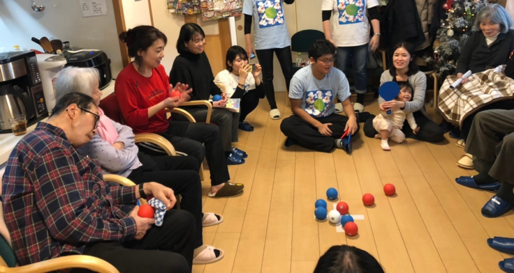 今回は、小規模多機能の利用者様と職員の方へゆめ旅の説明からさせていただき、その後ボッチャを行いました。