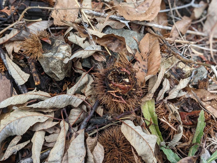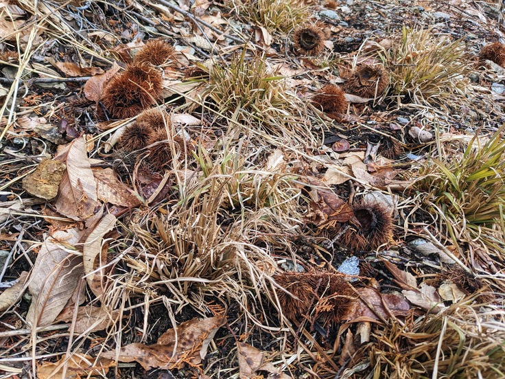 足跡を追いかけるようにそのまま進むと、栗の皮だけがたくさん落ちていました。