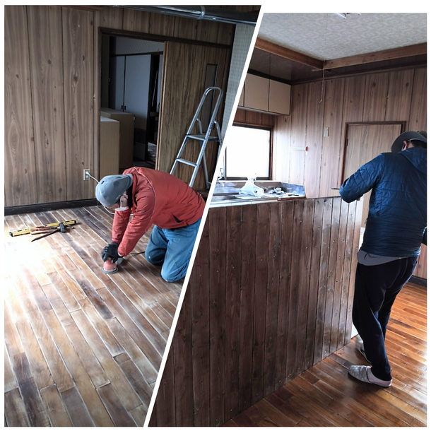床もクッションフロアーや絨毯が二重三重に敷かれていましたが、1番下のムクのフローリングまで剥がし超強力両面テープを根気強く取る作業をしました。