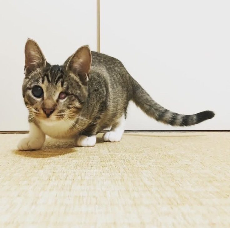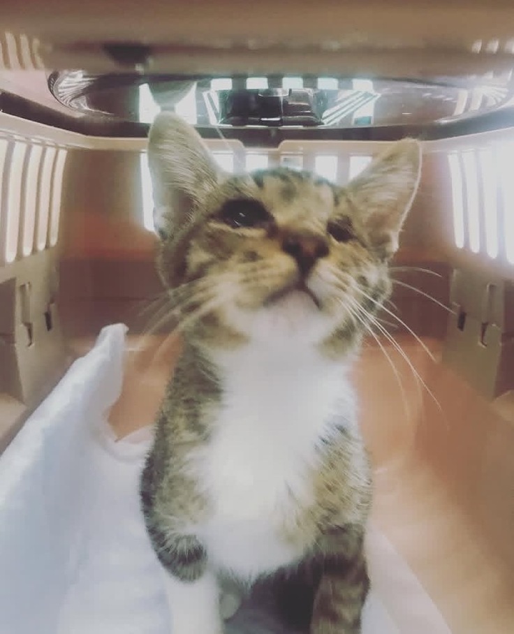 発見された当時、小さくガリガリに痩せていて、片目はすでに失われていました。生後2〜3か月ほどだったと思います。