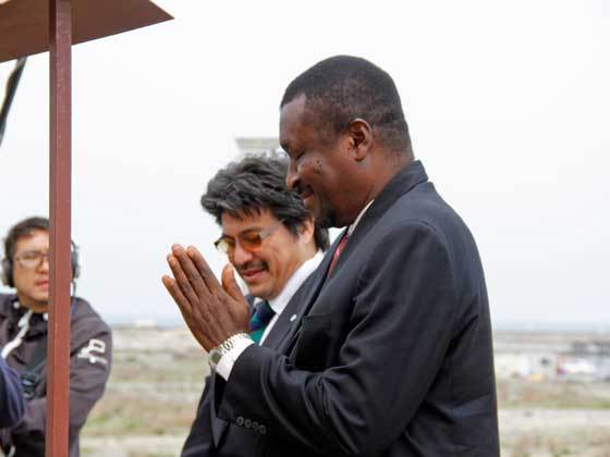 さて、5月26日になりますが、アフリカのスーダン共和国より来日していた人道支援局(HAC)のトップ、アリ・アダム氏と、名取市や岩沼市・亘理町で支援活動をし、私たち湊神社・富主姫神社も支援をいただいている認定NPO法人ロシナンテスの川原尚行理事長が日和山を訪れました。