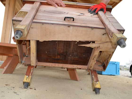 そこで一旦、賽銭箱を下におろし、今回のPJでお社を造った大工さんに急ぎ修理してもらい、1時間ほどで元に戻りました。
