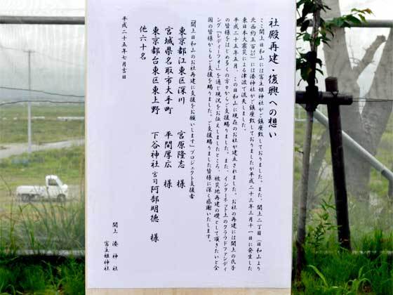 平成二十五年五月、この日和山に現在のお社が建立されました。お社の再建には閖上の氏子の皆様をはじめ多くの方々からご支援賜りました。また、インターネット上のクラウドファンディング「レディーフォー」を通じ現況をお伝えしましたところ、被災地再建の礎として頂きたいと全国の皆様からもご支援を賜りました。ご支援賜りました皆様に深く感謝いたします。