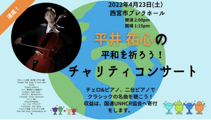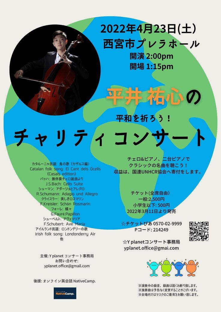 2022年4月23日、兵庫県西宮市プレラホールにて、平井 祐心の " 平和を祈ろう!" チャリティコンサートを開催します。チャリティコンサートでは、カタルーニャ出身のチェリスト パブロ・カザルスが1971年の世界国際平和ディに国連本部で演奏をし『カタルーニャでは、鳥はpeace,peaceと鳴く』とスピーチをした事により有名となった『鳥の歌』、二台ピアノとチェロで奏でるサン・サーンスの『白鳥』など、クラシックの名曲を中心に演奏します。