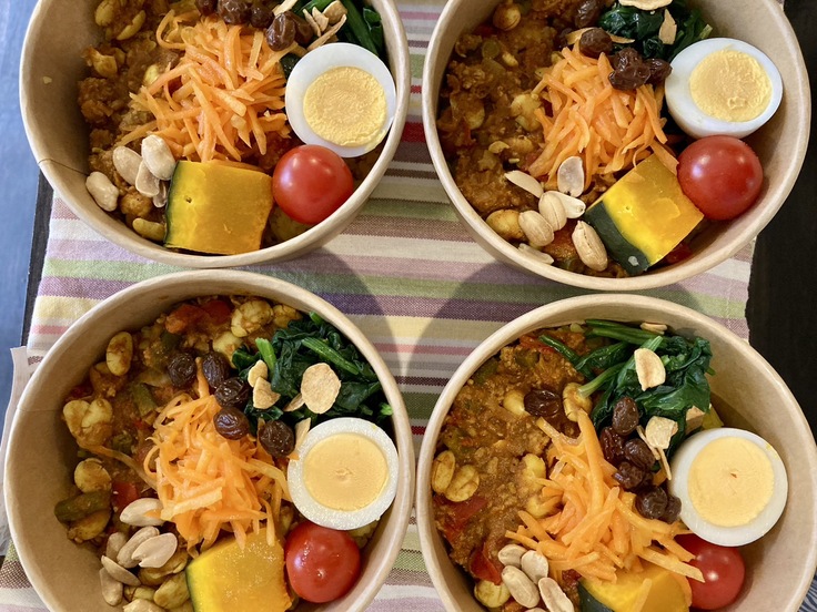 ユタカで販売している料理はできるかぎり手作りのお料理をご提供しています。 管理栄養士監修のお弁当はメインと野菜を中心としたおかずが 3 品ほど入っています。みなさんの元気の源になるよう、食品のバランスや糖質、脂質、塩分などに考慮した内容になっております。他にオリジナルスパイスを使ったドライカレー や量り売りのおそうざいを販売しています。新店舗は店内で食事ができるので朝ごはんやコーヒーをご提供する予定です。