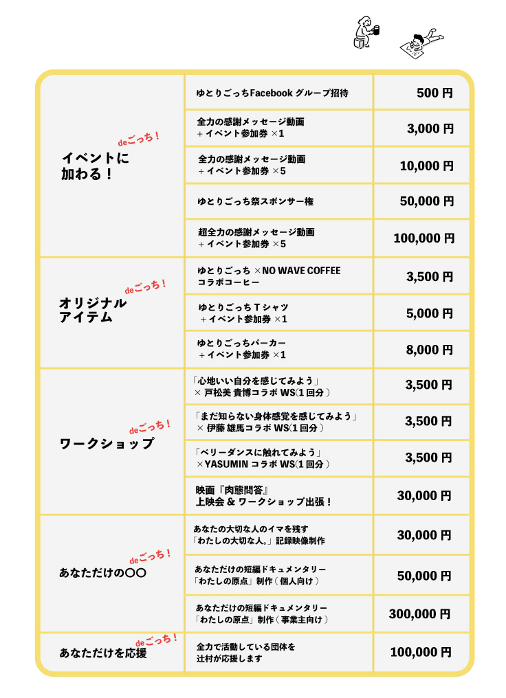 合同会社かるちべが主催となり、アーティストや参加者の方々の協力を得ながら、複数回にわたるワークショップやリターンの実施、2023年秋にイベント「ゆとりごっち祭」を開催します。