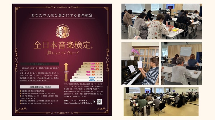 全日本音楽検定®(脳トレピアノ®グレード)は、一般社団法人全国ゆうゆう塾協会が主催する音楽検定グレードです。2023年7月から開始され、既に全国で、多くのシニア層を含む、音楽愛好家が受験しました。業界初!の大人の方に特化し、技術にとらわれない新しい検定であり、人気上昇中です。音楽を楽しむ皆様が、目標を掲げ達成する楽しみや表現する喜びを感じていただくことを目的にしています。努力を評価し、合格することにより、自信がつきます。そして、次の級や目標に繋がり、その結果、豊かな人生をおくっていただけます。