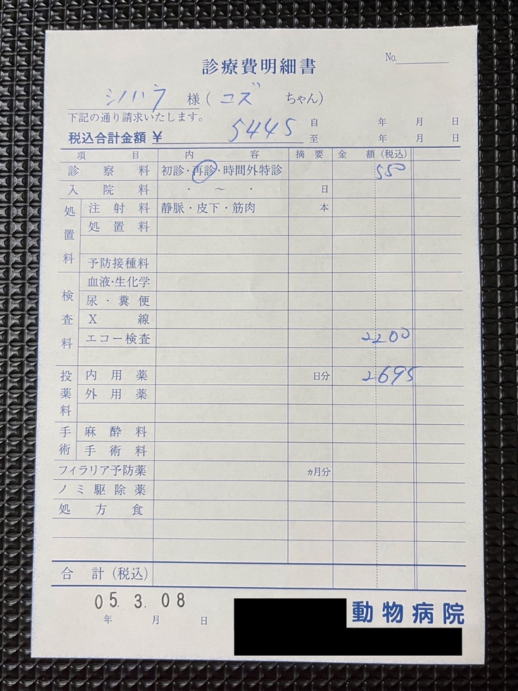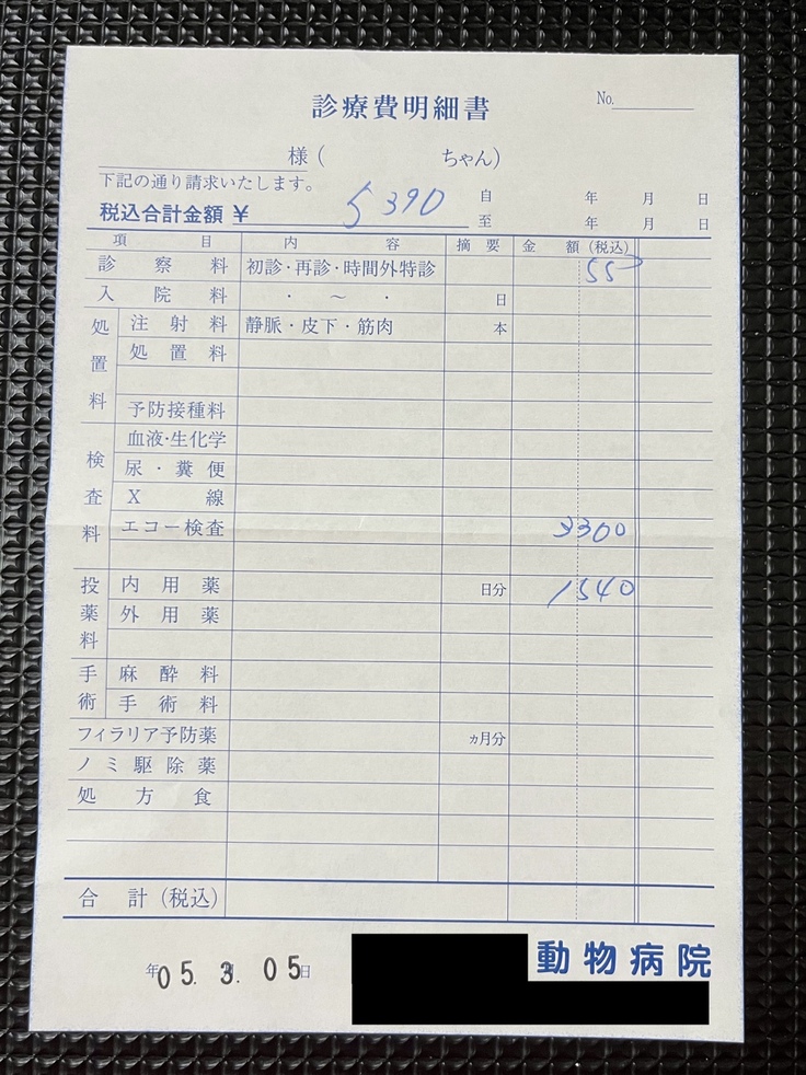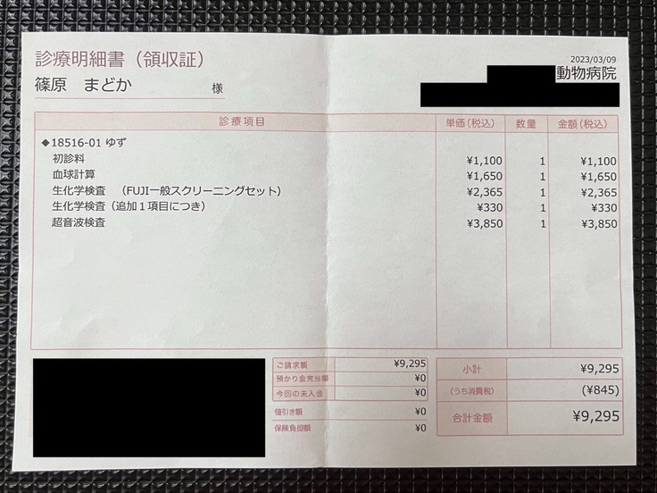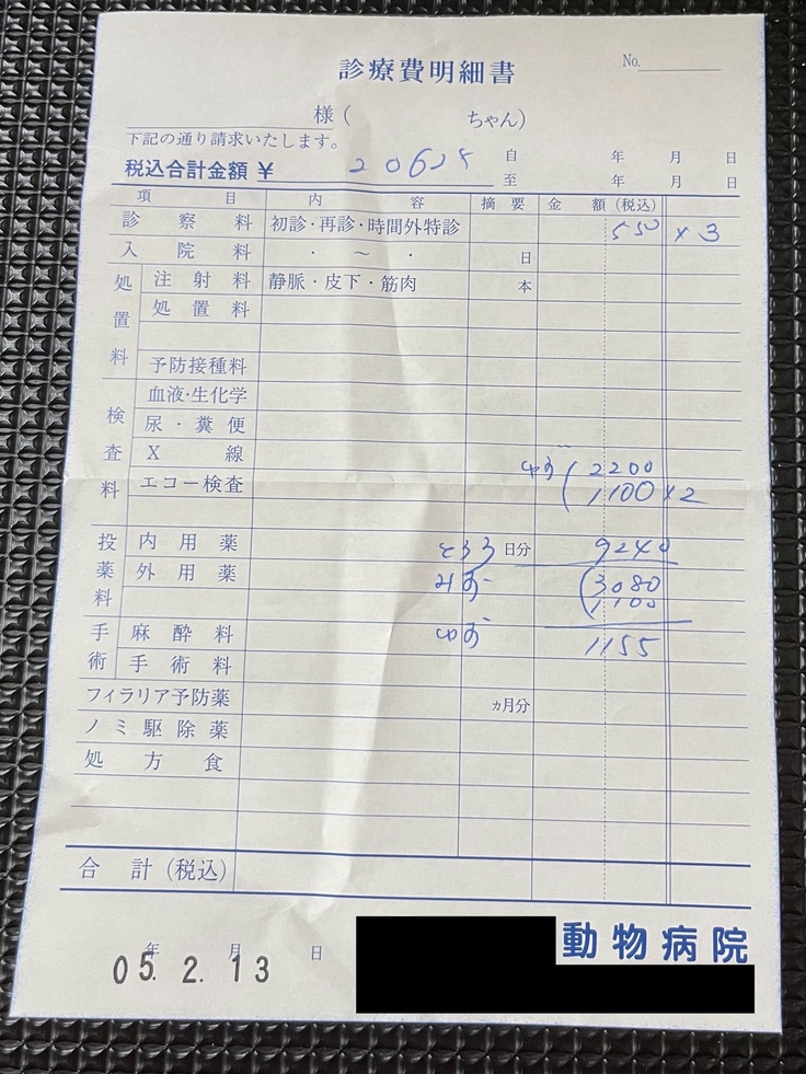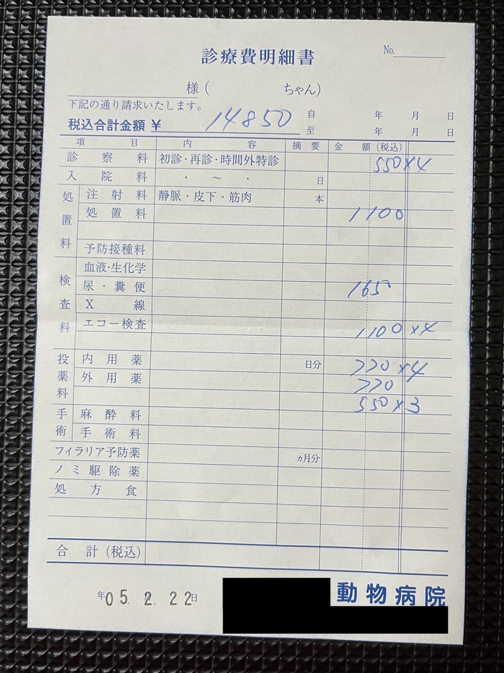 (直近のかかりつけ医での明細書になります。※一部、同居犬の分と合算されています。)