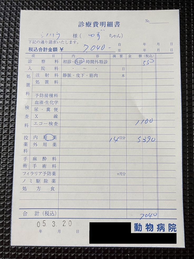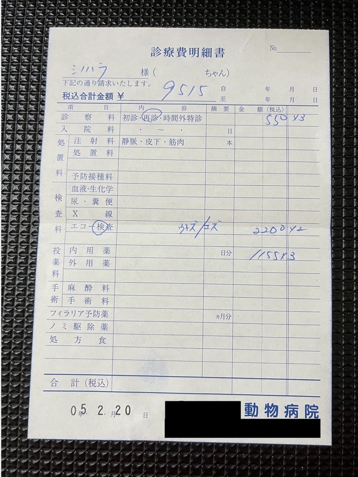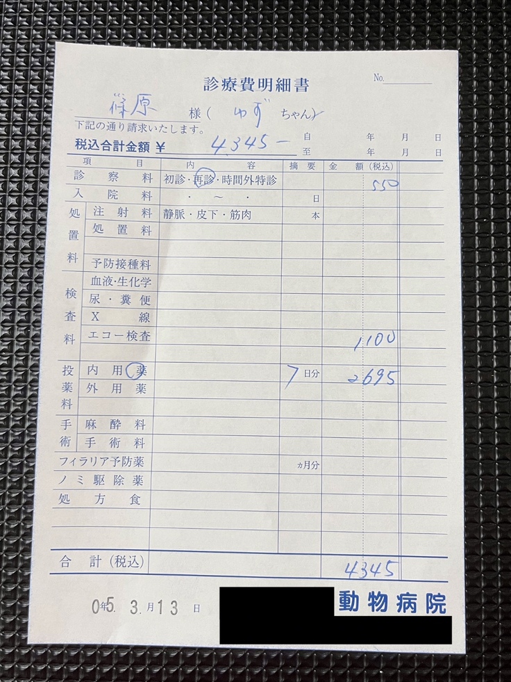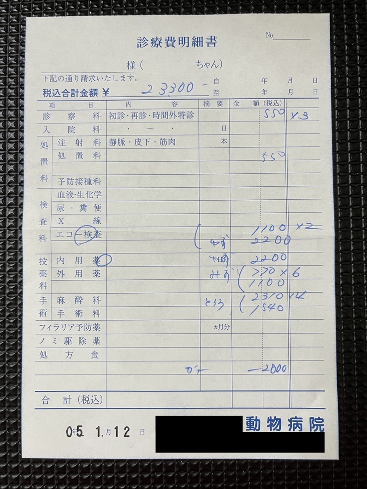 (直近のかかりつけ医での明細書になります。※一部、同居犬の分と合算されています。)
