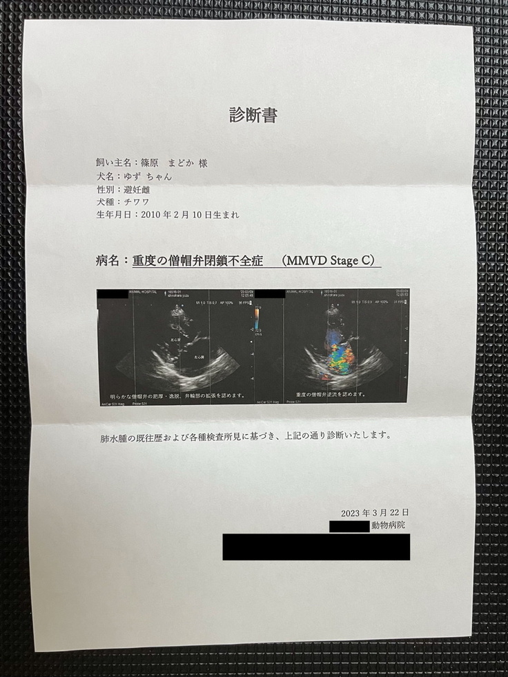 私自身2年半前に肺水腫、半年後に誤嚥性肺炎でチワワを2匹亡くしており、苦しんで亡くなっていく我が子を助けてあげれなかった経験があり、ゆずも定期的に検診しておりました。