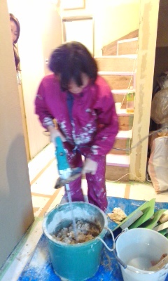 ※写真では茶色の珪藻土が乾いて白く美しい壁になるのが楽しみです。
