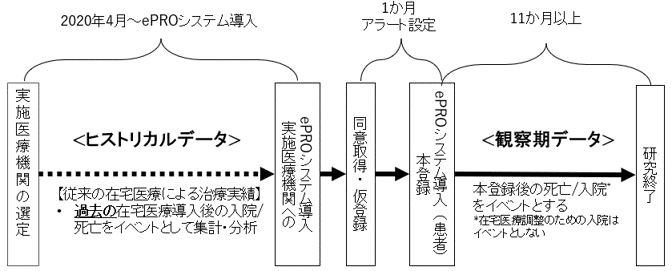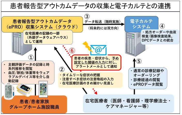研究では、在宅医療の現場において、ePROシステムに入力された患者さんの主観情報や血圧や脈拍といった情報を、研究を実施する医療機関の在宅医療関係者が遠隔でいつでも確認できるようにすることで、死亡や入院といった命に係わる出来事(イベント)を予防可能か調べることとなります。