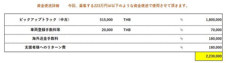 クラウドファンディングが成立したにも関わらず、差額分を確保できなかった場合、ピックアップトラックのレベルを落として購入を予定しております