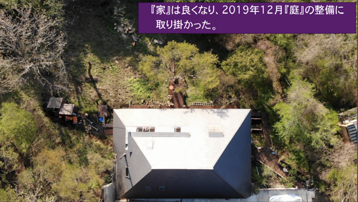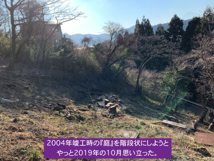 やっと苦労を乗り越えて、自分達が移築時の大昔2004年にしたかった事を思い出しました。ここで「食う寝る遊ぶ学ぶ」、『家』と『庭』の事です。家は良くなったから次は斜面の庭です。