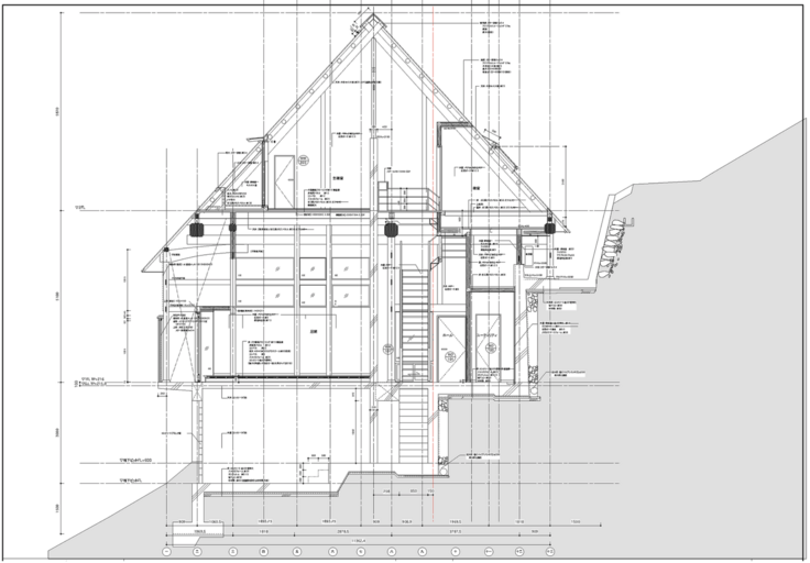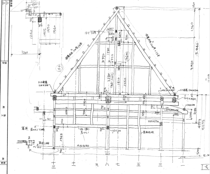 高層マンションが着工されていくなかで、江戸後期ではクレーンも無いのにこの様な太くて重たい梁を頭上より高く持ち上げ、崖に生え曲がった幹を使って屋根の登り梁を受け止めている、そのような構造がその地方で理にかなっていた建築物だったのでした。さらに現代の建築構造を駆使して山間でも住みやすく、バラや菜園を見ながらみんなで楽しめる広場を作ろうと考えました。そこで考えてたのが下のような図面です。