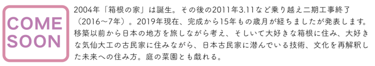 江戸後期以降、箱根は観光地と大変化してきました。今は再開発の進む中で、時代に取り残された様な雰囲気を残したままの気仙大工の古民家は、ある種の文化財のようなものかもしれません。