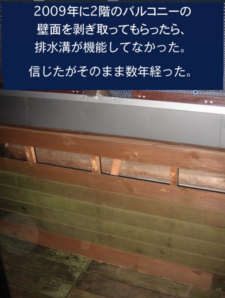 ところが、その竣工時から色々と問題が起き始めました。当時私は48歳でした。2003年建築が始まった当時と竣工の2004年、東京と箱根の地を行き来して生活をしていましたが、施工が進む家に問題があるとはっきりと気がついたのは2007年でした。一緒に建築を進めた設計者と建築チームいたのですが、竣工当時の最初の頃、「山に埋め込んだような形の移築だからコンクリは直ぐには乾かない」といわれたのです。直面した壁とバルコニーとの戦いの始まりでした。