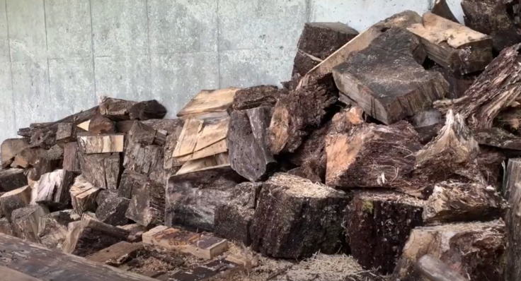 2021年に自然に庭で老木となって倒れた巨木を薪にしました。巨木の元の薪がベランダに一杯溜まりました。