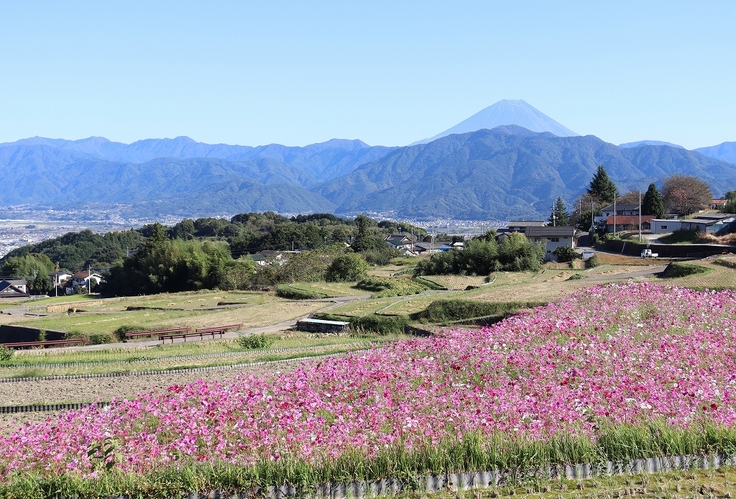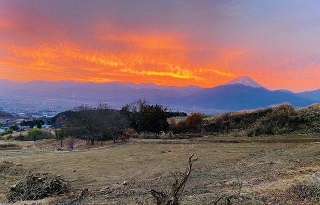 畑のとなりには曲線が美しい棚田が広がり、見渡す空には壮大な富士山が目に入ります。広さは1.2ヘクタール。ちょうどテニスコート45面ほどの広さです。