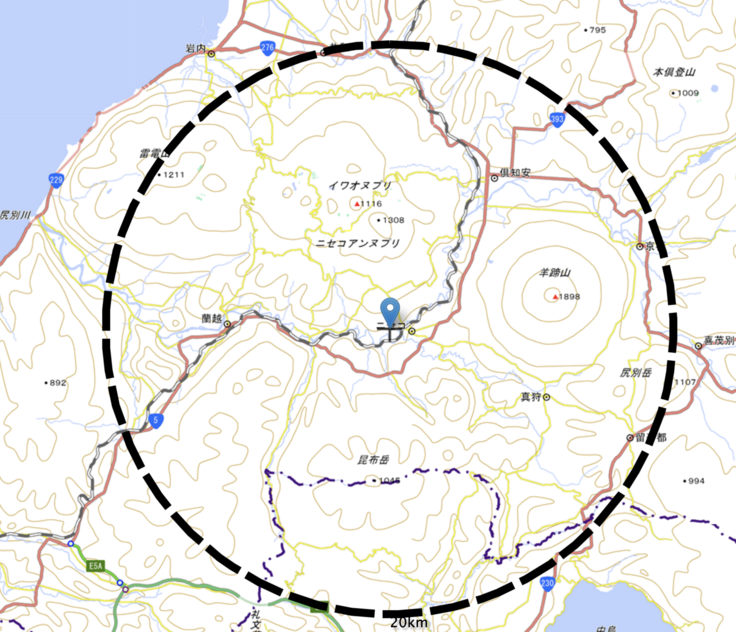 まずこれらのリターンにつきましては『実際の作業』となります。ですので、下記の地図に表示があります通り、ニセコより半径20キロ程度の距離に限定させて頂きたいと思います。