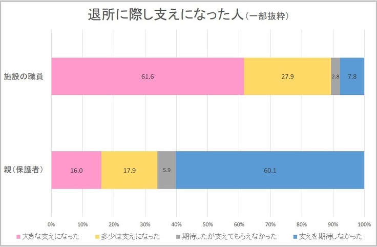 施設を退所する際、9割の若者が職員が支えになったと回答しています。退所後の住まい探し・同行や生活費のシミュレーション、就職活動のサポート、奨学金の案内など、幅広い支援が行われています。一方、6割の若者が親(保護者)には支えを期待していませんでした。