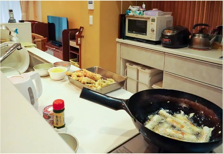 家庭的な施設のキッチン。料理を手作りしています