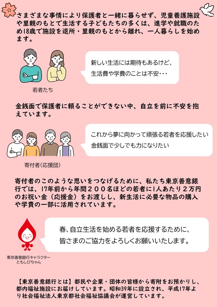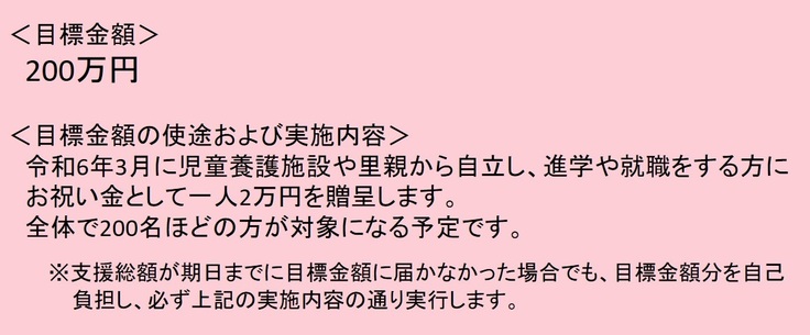 金銭的に保護者を頼ることが難しい若者が、少しでも安心して夢に向かって新生活をスタートできるように、施設職員や里親などの支援者とともに若者たちを応援いただきますよう、ご協力をよろしくお願いいたします。