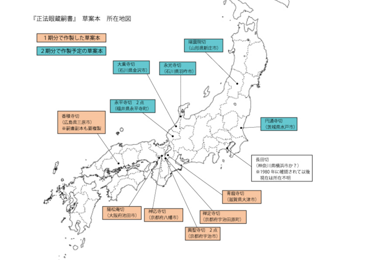 この「草案本」は、江戸時代になり26葉に裁断され、別々の寺院等に納められたことが広島県三原市香積寺に残る『正法眼蔵嗣書』草案本副本に記録されています。26葉に分かれた「草案本」断簡のうち、現在所在が明らかなものは11箇寺13葉のみです。