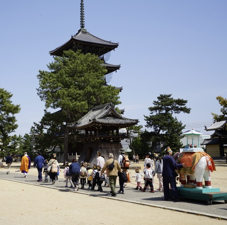 花まつり(仏生会)は、お釈迦様がお生まれになった日をお祝いする法会です。灌仏会(かんぶつえ)ともいいます。善通寺では、誕生仏をのせた白象をこどもたちが牽き、御影堂前から釈迦堂まで巡行します。釈迦堂での法会は、僧侶による読経ののち、花御所(はなみどう)に安置された誕生仏像に甘茶を濯ぎ花を献じて供養します。法会のあとには甘茶の接待があります。
