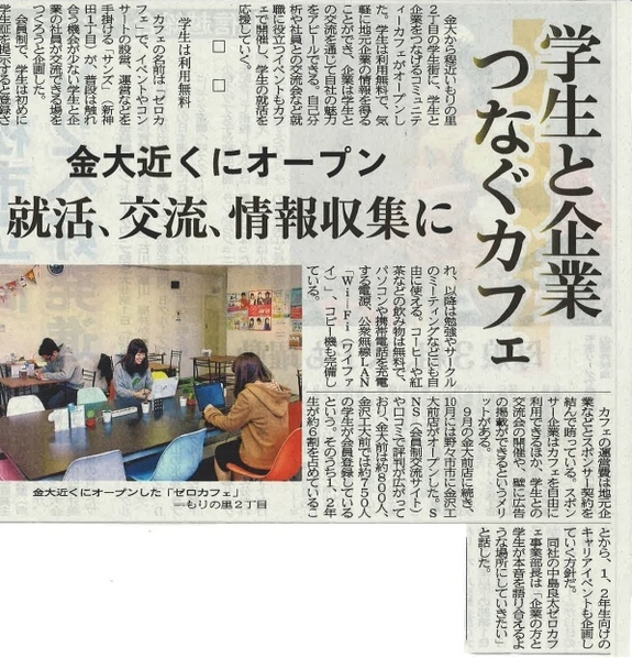 2015年10月に金沢大学前店、11月に金沢工業大学前店がオープンしたこのカフェでは、学生は無料でドリンク・wi-fi・電源・コピー機等を利用することが出来ます。新卒採用を考えておられる企業様にスポンサーになっていただき、就職イベントや会社説明会もカフェで開催していただけます。