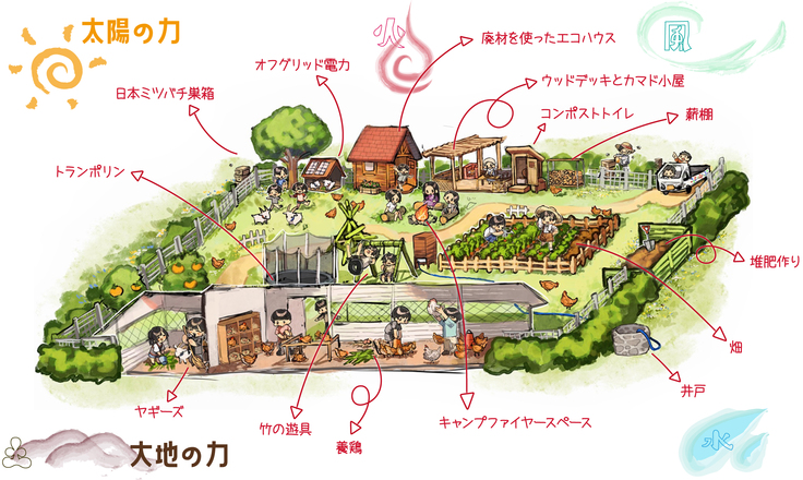 遊び、学びながら、子どもたちの「生きる力」を育み、地球の循環の仕組みや物の成り立ちを体験でき、子どもたちと一緒にこれからの未来を無限に創造していくフィールドを創ります。