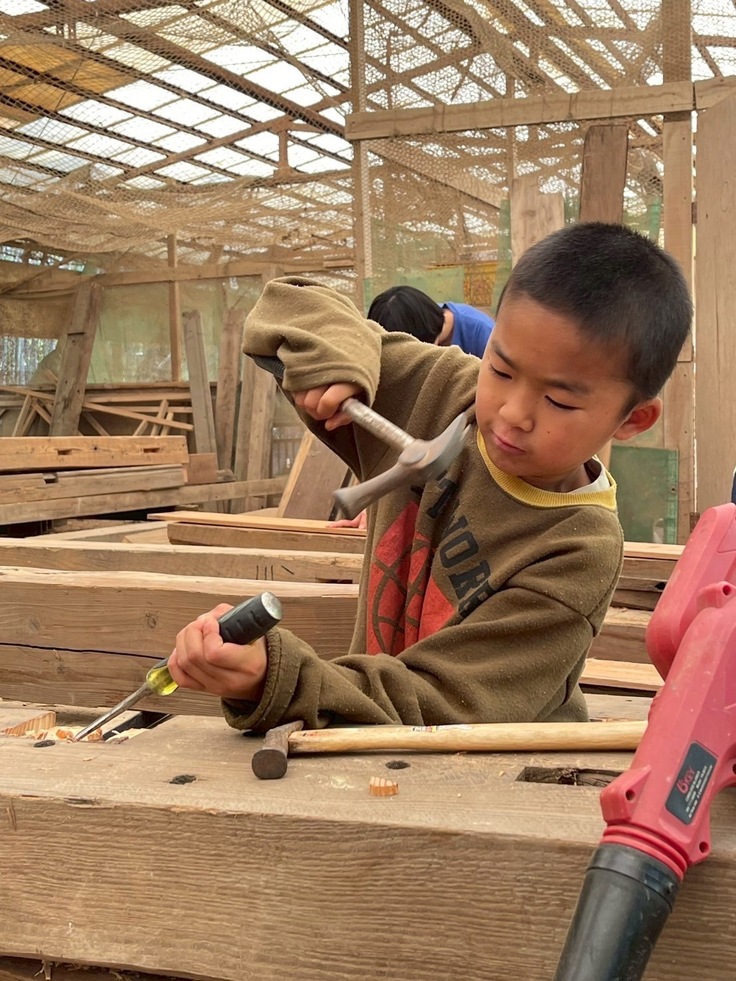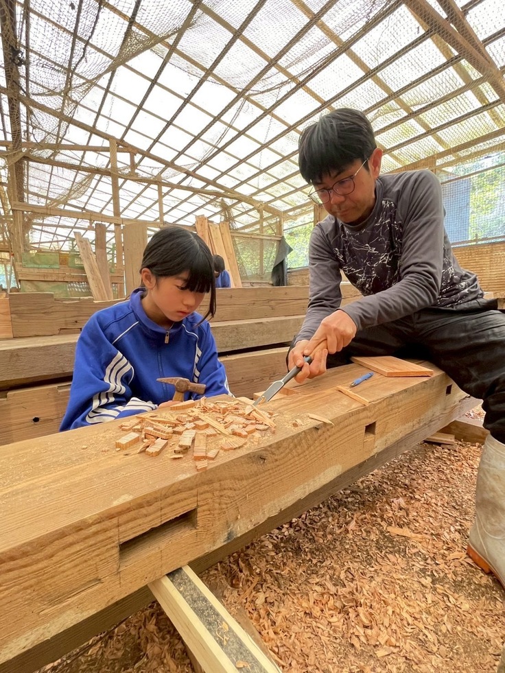 3月半ばから、大工さんに墨付けしてもらい、子どもたちとノコギリとノミを使い一つずつ木材を加工してきました♡