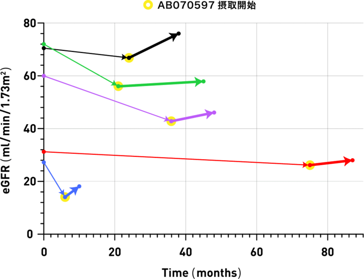下のグラフをご覧ください。被験者5名がそれぞれの色で示されており、黄色点でeGFR測定とAB070597の摂取が始まり、半年〜約2年後に再度eGFR値を測定したところ、全員が上昇していました。
