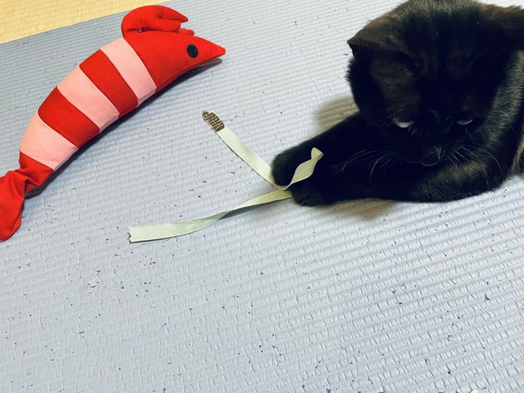 1.ふわふわ赤ゴム 2.水色リボン 3.エビのぬいぐるみ
