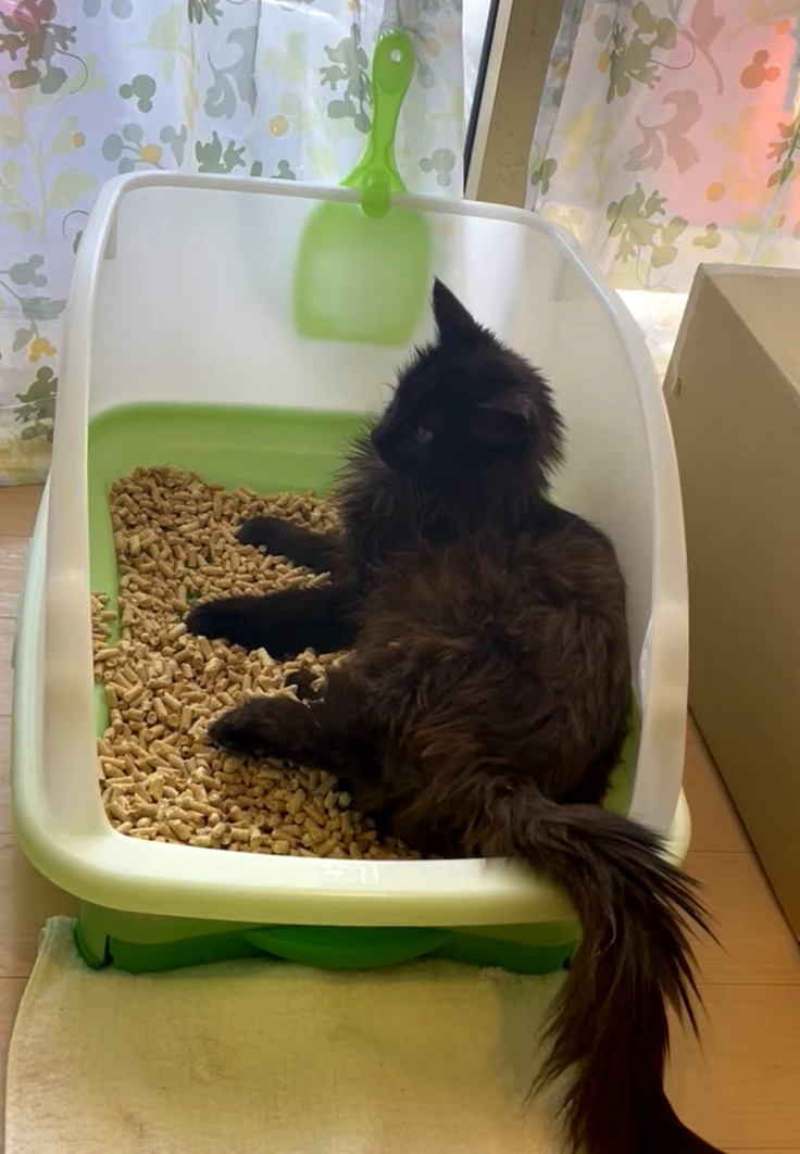 保護したばかりは、警戒して暗い所にずっといる。トイレもいかない。ご飯はガッついて食べる。