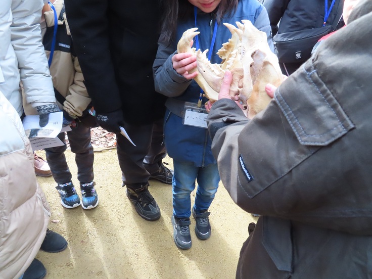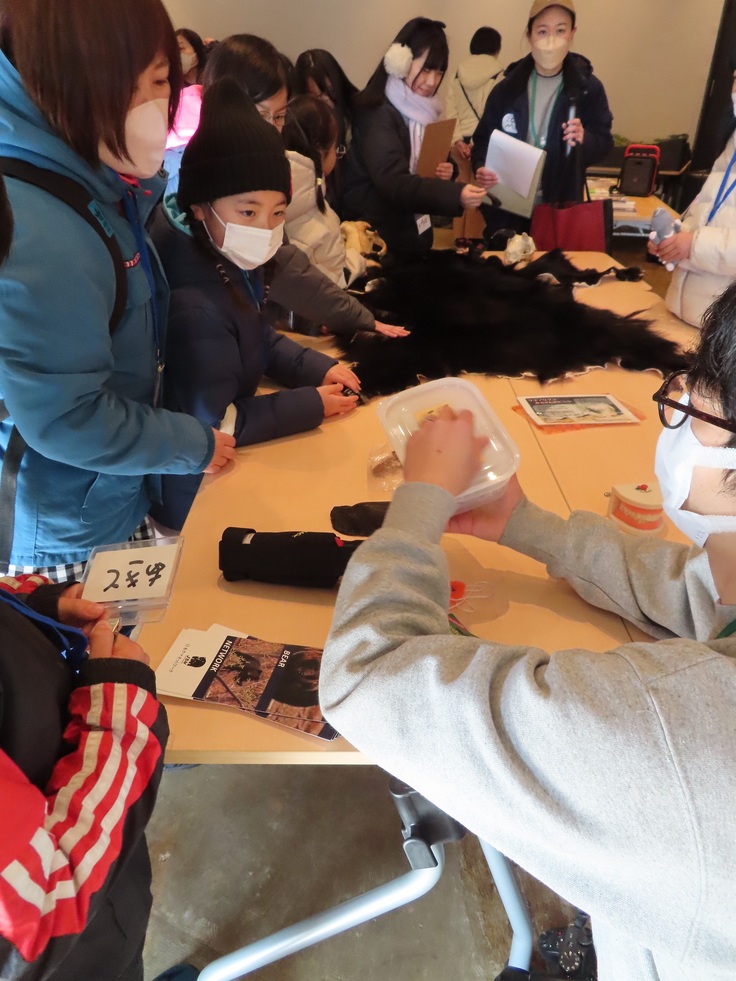 観察の順番待ちの間には、通常時と秋の給餌量の違いを体験してもらったり、植物中心の雑食性であるツキノワグマの歯のつくりが肉食動物や私たちとどのように違うか、似ているところはどこかを標本を使って観察してもらいました。