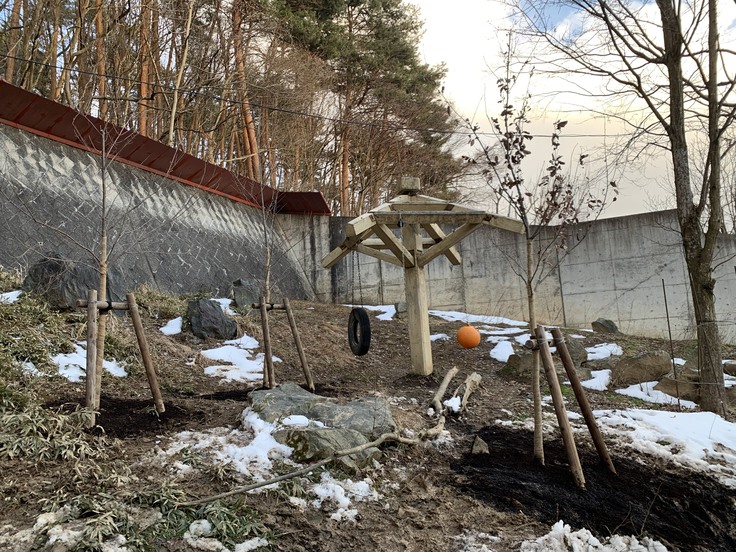 作業していただいた業者さんによると、放飼場の土が粘土質のため根付くのは簡単ではないとのことでしたが、土壌改良もしっかりとしてくださいました。当園のニホンツキノワグマ2頭が早々にかじってしまわないようにしっかりと育つまでは電柵で囲いますが、この先枯れてしまう可能性もあることをご理解いただけますと幸いです。