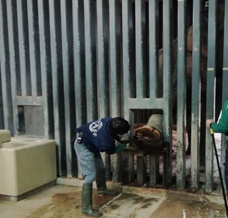 また、体重の重いインドゾウにとって、足の裏のケアはとても重要です。足の洗浄や蹄のチェックは毎日欠かさず行っています。