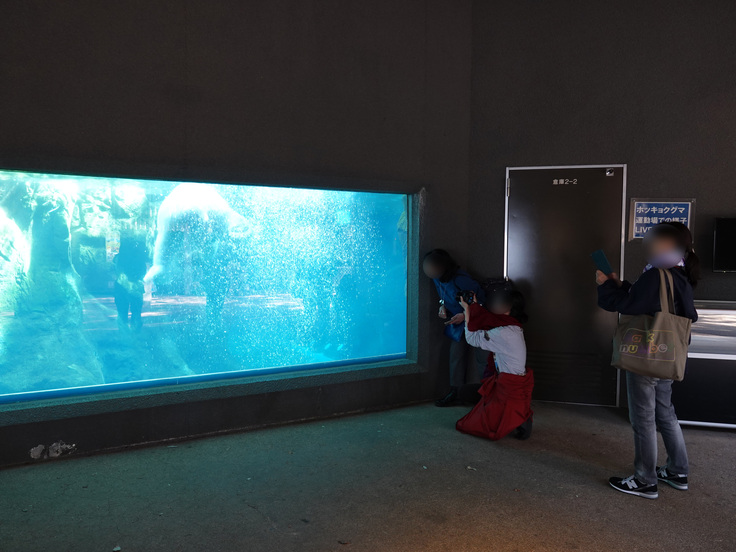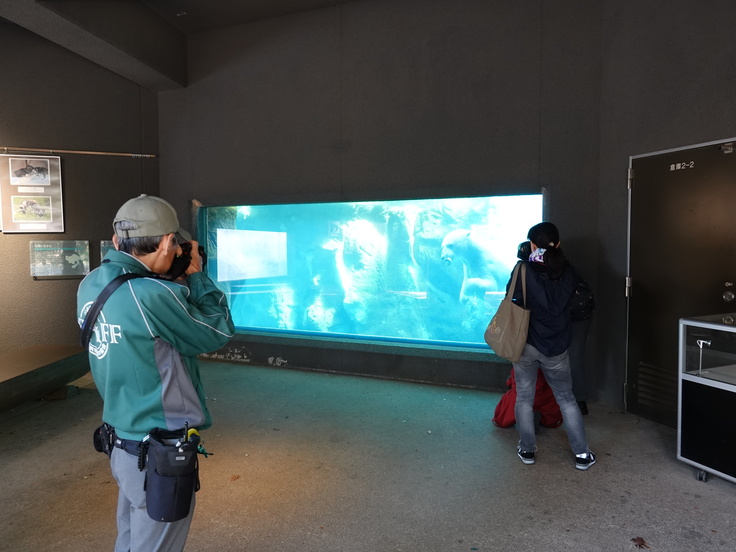 ホッキョクグマ水中ビューに集合してすぐ、ホッキョクグマのエサやりを見学しました。