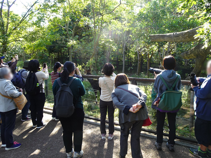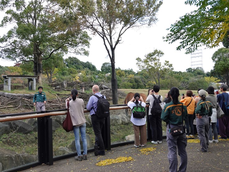 順番を待っている間は、普段は入れないデッキに入って、飼育員のお話を聞いたり、いつもより近くで草原エリアを観察していただきました。