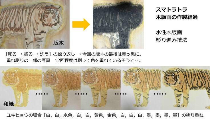 務川さんに教えていただいた製作方法を簡単にまとめた図を作りました。途中経過の写真を送っていただきました。ユキヒョウの場合は,同じ「白」や「墨」でも重ねていっているようで,非常に時間をかけて丁寧に製作されていることが(私は素人ながら)想像できます。務川様,ありがとうございます。