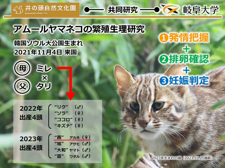 文化園と当研究室は,2012年からアムールヤマネコの繁殖生理に関する共同研究を行っています。この母アムールヤマネコの”ミレ”について,ツシマヤマネコ同様に,発情の把握,排卵の確認,妊娠判定などの研究を文化園と共に行ってきました。アムールヤマネコでの研究は,アムールヤマネコ自身のためだけにとどまらず,ツシマヤマネコにも生かされます。この繁殖生理研究に加えて,今回このような形で,アムールヤマネコとツシマヤマネコがつながる(アムールヤマネコの繁殖が役立てられる)ことになるとは思ってもいませんでした。非公開なので,陰ながら応援したいと思います。